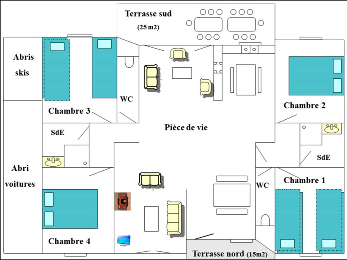 - Chambre 3 : 3 lits simples (90 cm), dont 2 superposés